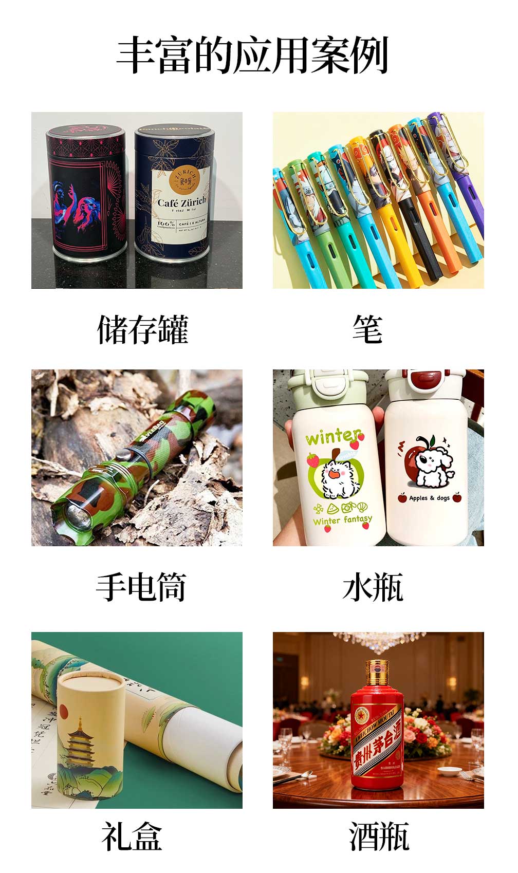 广泛适用于如保温杯,杯子,化妆品包装瓶,酒瓶,铝罐等以及其他工业、目用类圆柱/圆锥形包装